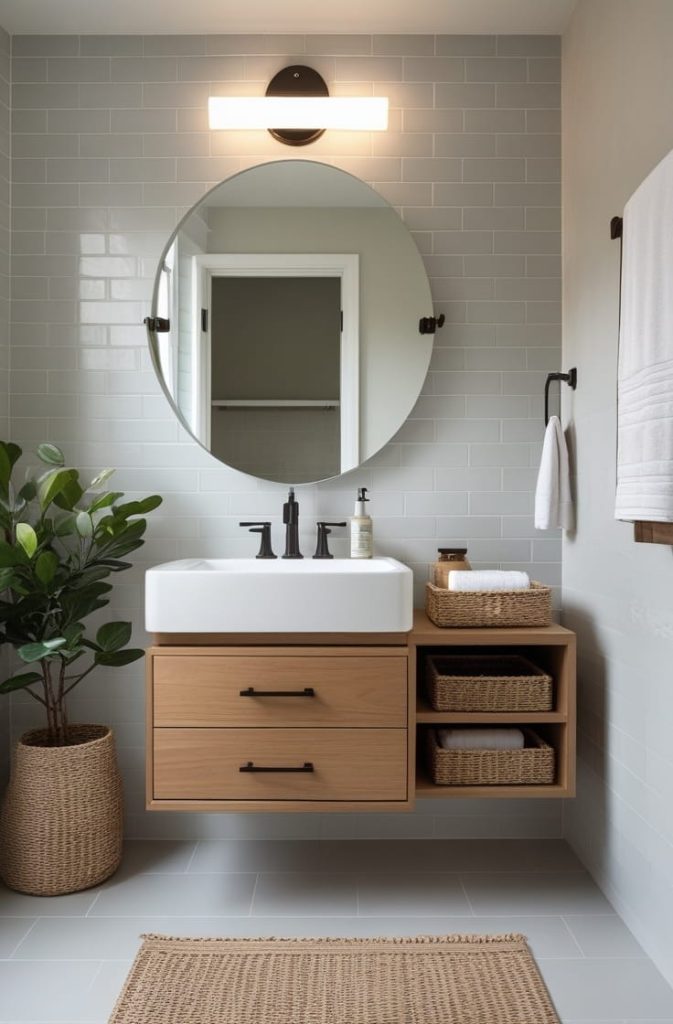 Floating vanities also create valuable room underneath for baskets, small hampers, or rolled towels. In tiny guest bathrooms where storage is limited, I love adding stylish woven baskets or slim organizers beneath the vanity to keep everything tidy. This is especially useful when you want guests to feel like the essentials are accessible without rummaging around.